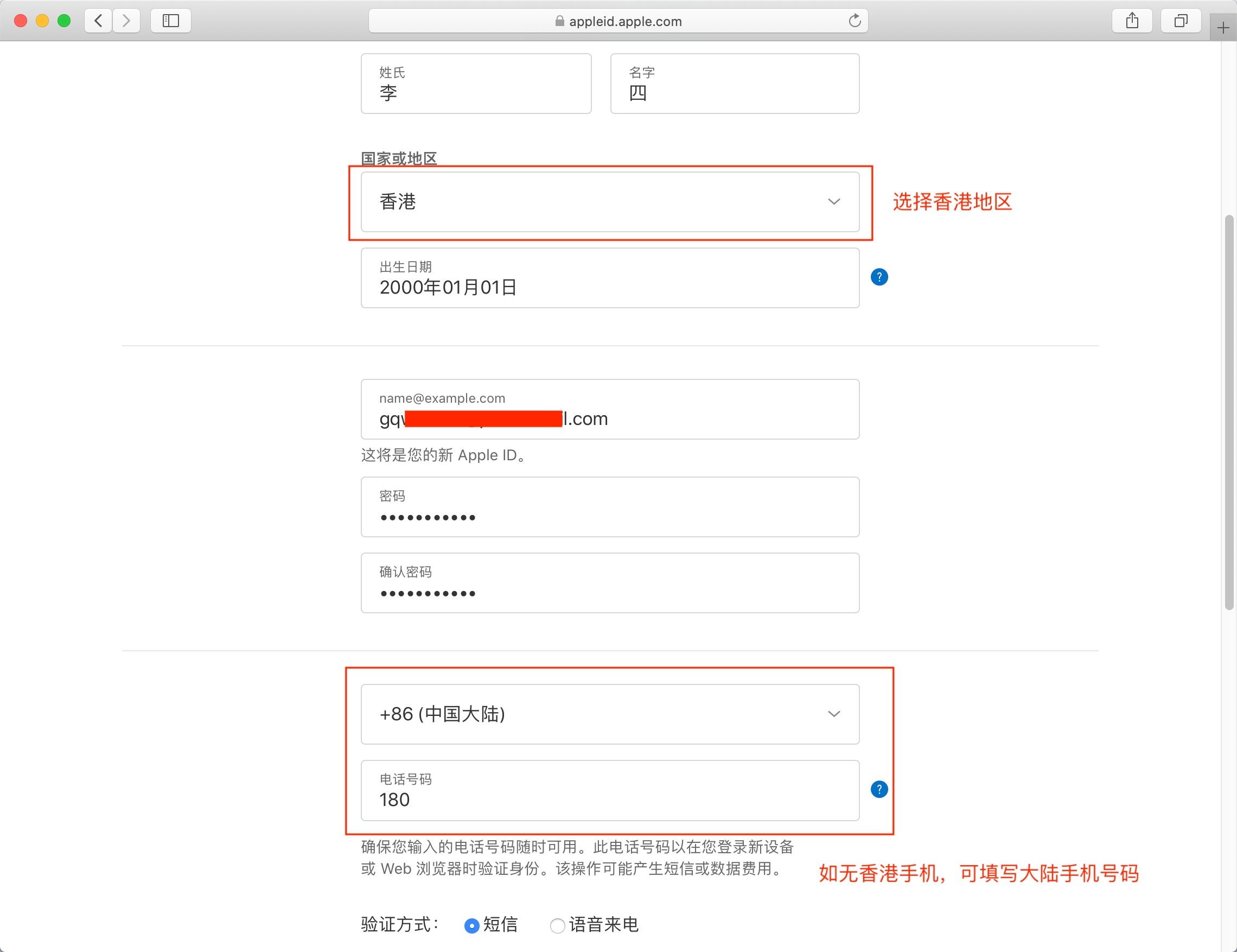 2.填写姓名、出生日期、邮箱、密码等信息。下面以港区为例,国家或地区选择香港, 填写待验证的手机号码,如无香港手机号码,可以选择并填写中国大陆手机号码。